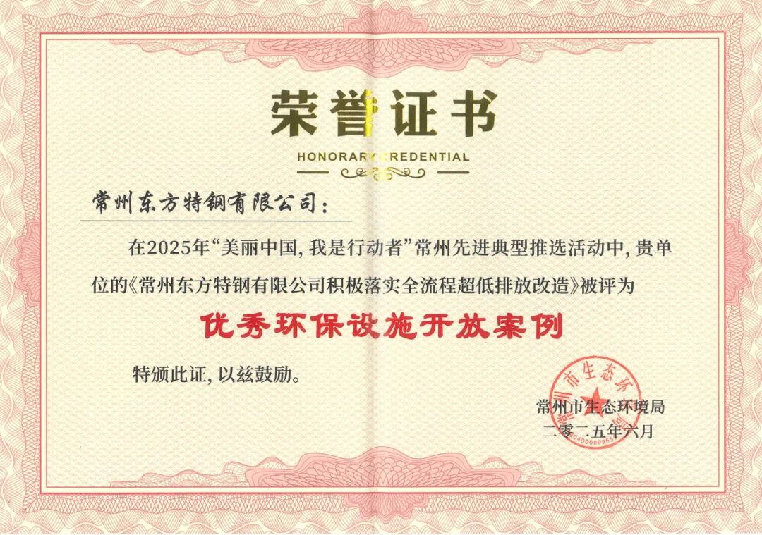 在常州市生态环境局组织的2025年"美丽中国,我是行动者"活动中,东方特钢的全流程超低排放改造项目被评为优秀案例。该项目通过对企业生产全流程进行超低排放技术改造,各项环保指标达到先进水平,展现了企业在环境保护领域的创新实践和责任担当。