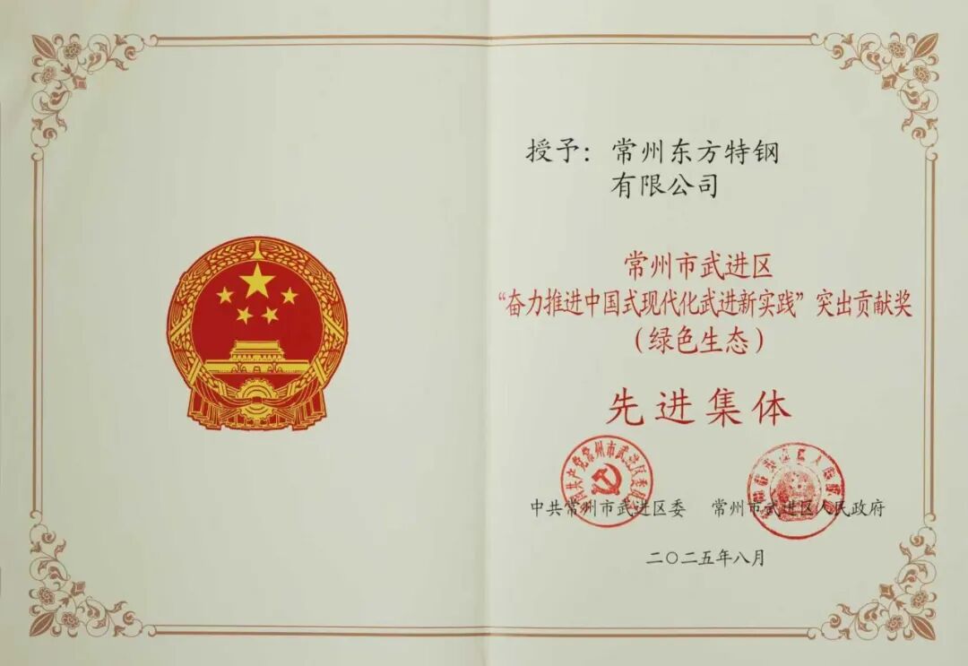 中共常州市武进区委、区人民政府授予东方特钢“奋力推进中国式现代化武进新实践”突出贡献奖(绿色生态)先进集体,表彰企业在区域生态环境建设中的实际贡献。